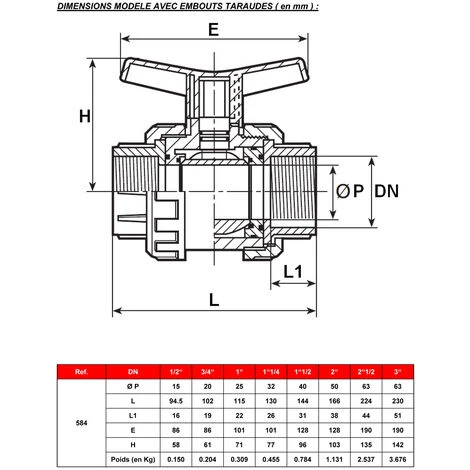 Pression maxi admissible PN : 16 bars jusqu’au DN 50.Respecter le sens de passage indiqué sur le corps par une flèche. Modèle 3 pièces.