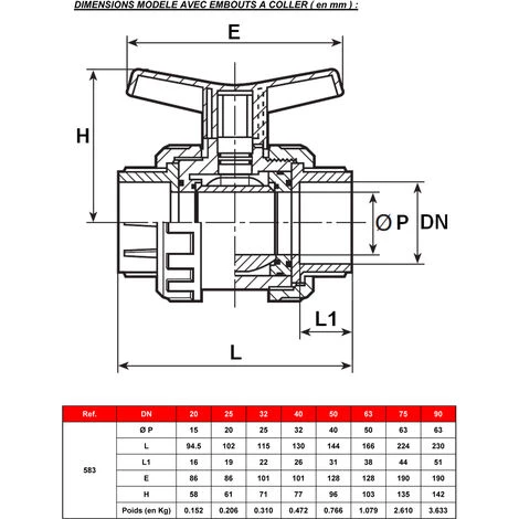 Pression maxi admissible PN : 16 bars jusqu’au DN 50.Respecter le sens de passage indiqué sur le corps par une flèche. Modèle 3 pièces.