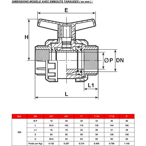 Pression maxi admissible PN : 16 bars jusqu’au DN 50.Respecter le sens de passage indiqué sur le corps par une flèche. Modèle 3 pièces.