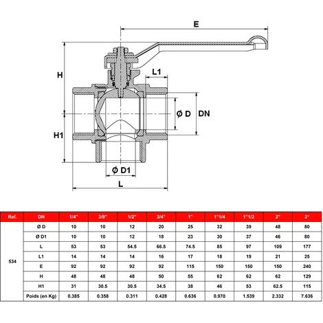 Série 534 – Vanne à sphère laiton PN25 Série 3 voies – 3 positions – Lumière en L.